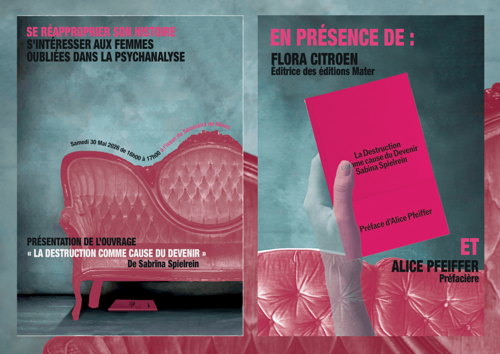 A l’issue du séminaire de Nîmes le 30 mai, auquel nous vous espérons nombreux, la FFDP organise une présentation de l’ouvrage récemment traduit et publié « la Destruction comme cause du Devenir », de Sabina Spielrein, éd. MATTER, en présence de l’éditrice Flora CITROEN et de la préfacière Alice PFEIFFER.